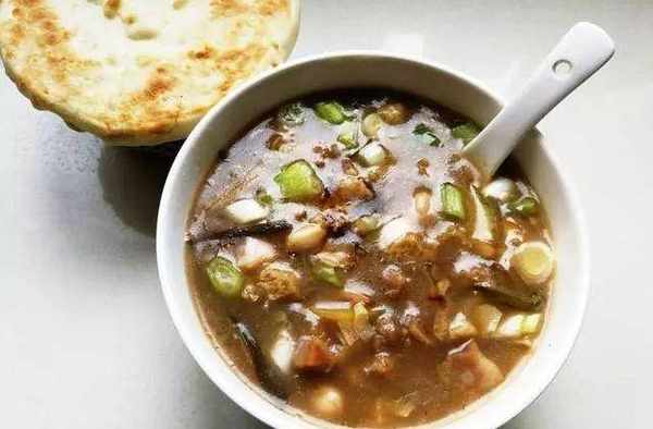 先要炖牛肉汤。牛肉切成小粒,放大葱,蒜,姜,花椒,八角,干辣椒,这些东西可以装到过滤袋里,在慢炖锅里炖个一晚上。然后取牛肉和汤。花生米,粉条,金针菜,海带丝这些东西都要先用水泡一阵。其实这些材料不用很全,缺一两样都没有关系。把需要切的材料都切成丝。做面筋。往面粉里加水,不要太稀,然后可劲抓,抓一段时间,把水倒到别的碗里先留着下一步用,把粘稠的面筋留下来放大火蒸,大概十几分钟就可以蒸成一块凝固的大面筋,然后切成小块。往牛肉汤里加各种材料放火上煮。同时把刚才做面筋留下的水也加入到牛肉汤里煮。如果还嫌不够粘稠,再加面粉和淀粉到汤里,反正一定要汤够稠才好喝。然后加盐,味精,十三香和胡椒粉,重点就是加胡椒粉,可劲的加白胡椒粉,不然味道绝对不够正。。大概20分钟锅里的各种材料就可以煮熟了。然后就可以愉快的开吃啦。当然如果出锅的时候撒上一点香油和醋应该味道会更好。