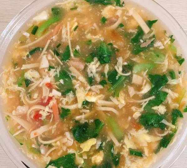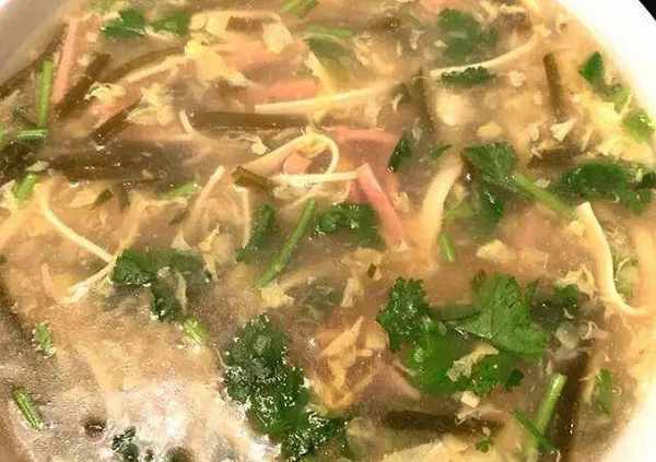 1.葱姜切沫,海带、火腿、百叶切丝。百叶丝开水烫一下去除豆腥味,觉得麻烦可以不做。2,锅内少许油,放入葱姜沫炒出香味(注意这里要快一点,火小一点,不然很容易就糊了),加水烧开3.水开后放入海带丝、火腿丝、百叶丝。4.再次煮开,加入少量淀粉至稀糊状,新手不好拿捏稠稀,可以先少量来,不够稠就再调入一点,不然一次过多容易太稠。5.鸡蛋打散锅开淋入成蛋花,随后加入盐、胡椒粉、生抽(少量提味)、醋两勺,喜欢吃酸的可以多加,具体根据自己口味调就行,小白不会把握量,就少量多次的加,不用着急。撒上香菜,出锅~我的勺子是大的,其实我自己都是感觉,小白可以参考这个勺子的量。具体还要看水的量