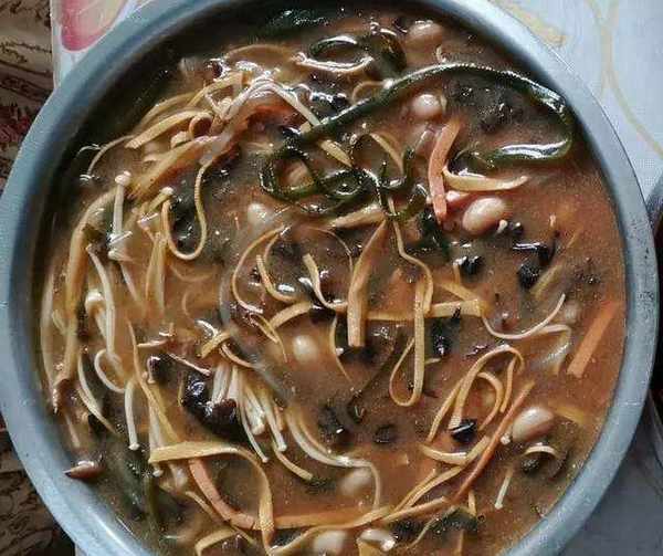金针菇,豆片丝,还带丝,黄花菜,海菜丝煮两次,这样有效去除沙子花生米。木耳丝,火腿丝,粉条起锅烧油,用牛肉丁,爆香把配菜放进去,放牛油,芝麻酱,老抽,咸盐,黑胡椒最后快熟的时候放水淀粉,一点一点放搭配油条吃