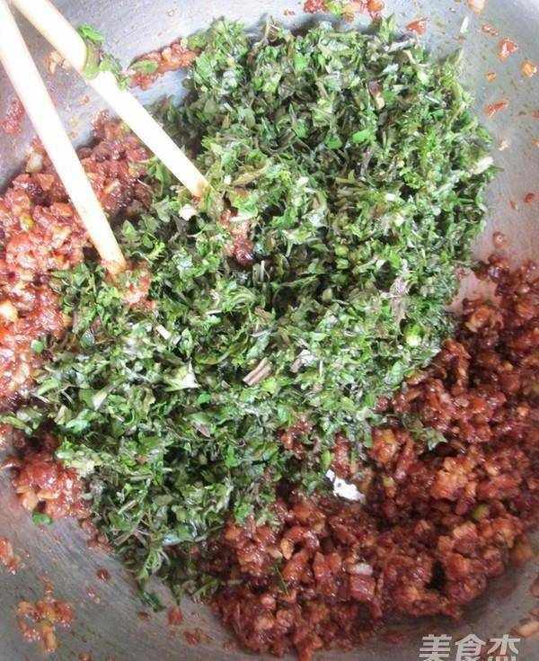 4.把肉馅放葱姜末,生抽,盐,花生油拌匀,把剁好的荠菜放入
