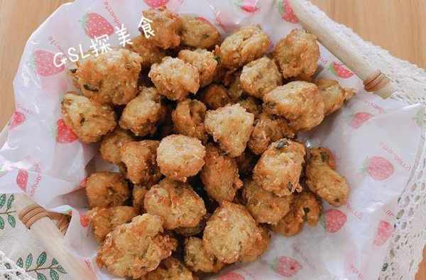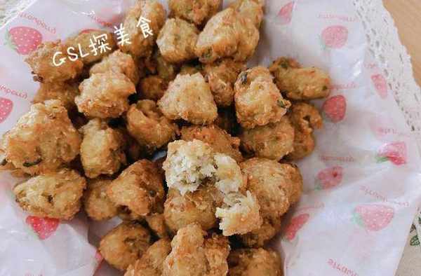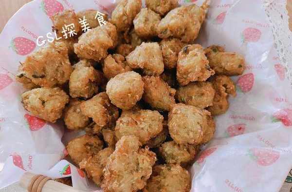 第3步,锅中放入油,等油热之后改成小火。高温下油锅能够让丸子表面定型快,而且里面还不吸油。然后用手挤丸子放进锅中,小火油炸,炸制表面金黄即可,控油捞出。