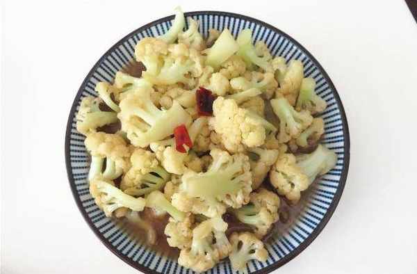 做法:菜花去根,掰成小朵用盐水浸泡10分钟,冲洗干净,葱姜和干辣椒切好;锅中放入油,烧热后倒入葱花、姜丝和干辣椒爆香;倒入菜花翻炒均匀;加入生抽炒匀,加少许水煮一会;加盐拌匀翻炒入味即可