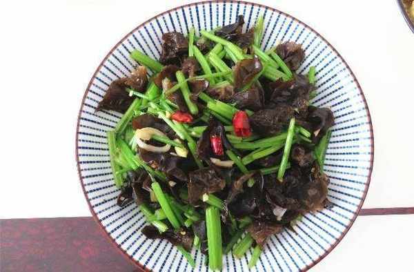 做法:芹菜去根去叶,洗干净切成5厘米长的段放入烧开水的锅中,里面加少许盐和几滴油汆烫十几秒捞出沥干水分;黑木耳用温水泡发;葱和蒜切成碎末;黑木耳将根部去掉,冲洗干净,也放入开水锅中汆烫几秒捞出沥水;锅中倒入油烧热,倒入葱花、蒜末、姜丝、干辣椒段炒香,倒入木耳翻炒均匀;倒入芹菜段翻炒均匀;最后加盐调味就好了