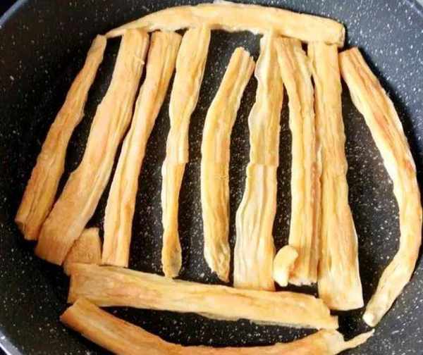 浸泡好的腐竹,我们捞出来沥干水分,如果腐竹太长的话,我们把它撕短一点。然后锅洗干净擦干水分,倒入适量的食用油,油热后我们把沥干水分的腐竹倒入锅里,小火煎炸至两面金黄,并且腐竹变得稍微硬的时候,我们把腐竹捞出来沥油备用。煎炸腐竹的时候,切记小心一点,不要因有水,油战到身上烫伤。