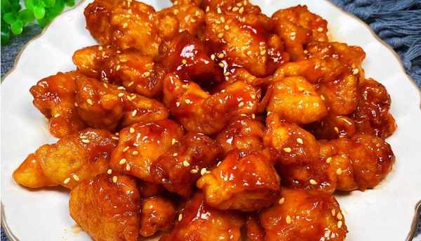 5.锅留底油放入糖醋汁稍微煮至粘稠倒入炸好的鸡块快速翻拌均匀即可出锅,撒上白芝麻