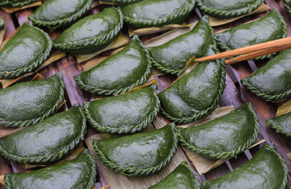 由于广东地区湿气较重,客家人喜欢吃艾粄来祛湿补气,形成当地独特的清明文化,甚至流传“清明前后吃艾粄,一年四季不生病”这样的俗语。“粄”指的是客家话里糯米、粘米糕点。将艾草打碎成汁混入糯米粉中,再加入花生、芝麻、黄糖等馅料,压得扁扁的上笼蒸制而成,相比青团,颜色并不那么鲜绿透亮,但艾草味更浓。