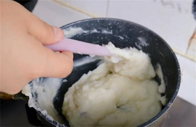3.把这个山药泥捣好之后,咱们炒一下,锅里面先放黄油,这个黄油有点软化的时候,就把山药泥倒进去,多炒一会儿,把山药泥里面的水分炒出来。