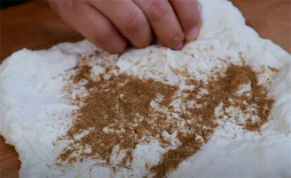 4.把这两种面团揉在一块,揉圆了之后把这个面团搓开,里面撒上自己喜欢的调料,我放了十三香,大家可以放点花椒叶进去,味道会更好。