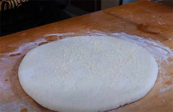 6.再用擀面杖擀开,上面刷一些清水,撒些白芝麻上去,想吃口感偏软一点的朋友,就先盖上保鲜膜,饧上十分钟。