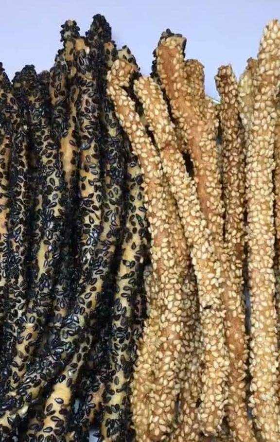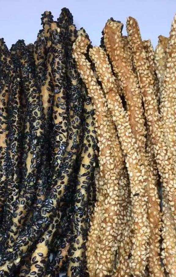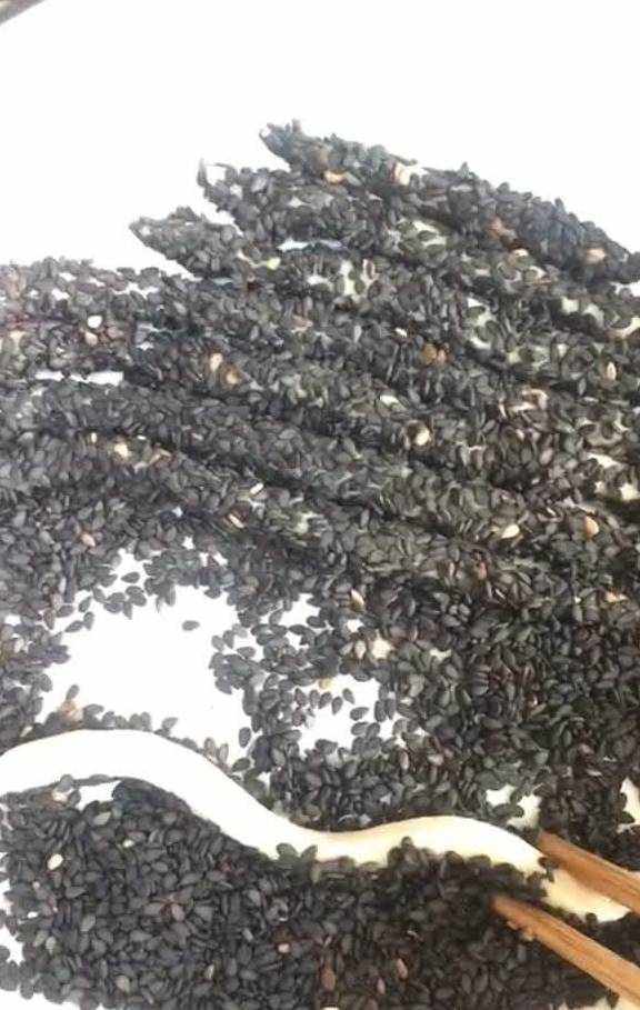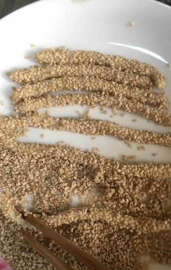 饼条先蘸点牛奶,再粘上一层芝麻,白芝麻、黑芝麻各准备一点,来个黑白配吧!