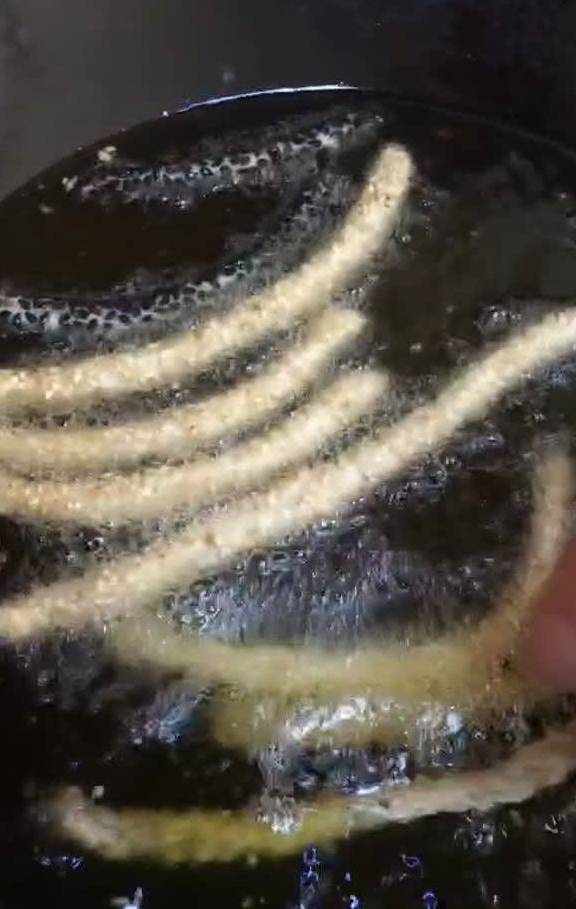 油温5成热就可以下锅炸,炸到飘起后就表示熟了,与炸油条有点类似,中途不停的用筷子搅动下,防止它们黏在一块。