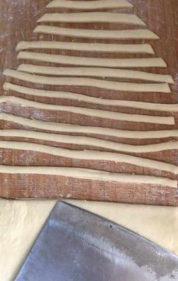 先用擀面杖擀成薄皮,刀蘸点油或者干粉,把它切成小长条状,宽度大概与小拇指差不多,切的时候用它来当参照物最好不过了。
