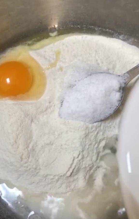 找个干净的碗或者盆,放入两大勺的面粉、一勺白糖、一个鸡蛋搅拌均匀,然后继续下个步骤。