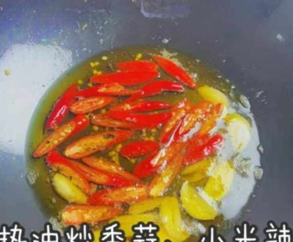 5:锅中多加上一些食用油,加上一些蒜片,小米辣和姜末,大火快速爆炒出香味,倒入肥肉炒出肥油,然后瘦肉炒至变色。