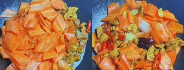 6:倒入一些胡萝卜片,加上一小勺蚝油,加上一小勺鸡精,加上适量食盐和白糖,翻炒均匀。