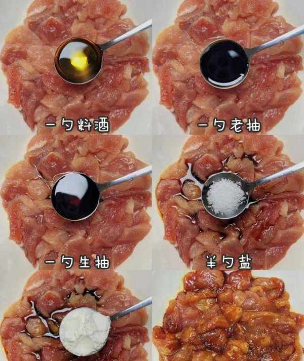 4:加上一勺料酒,然后加上老抽和生抽一勺,加上半勺食盐,裹上一勺淀粉,让猪肉片非常鲜嫩,抓均匀腌制10分钟左右。
