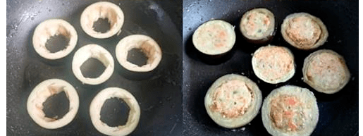 第一步、将茄子清洗干净切成薄圈, 茄子片用勺子挖去中间白瓤,然后把白瓤切成丁(茄子片中间挖空,留下边缘部分)。 准备小盆清水,泡在水中防止氧化变黑(茄子的皮很有营养,不用去皮)。