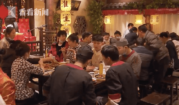 晚上9:30左右送走最后一批客人,结束了一天的忙碌,南京大排档七宝万科店近50名员工终于有空聚在一起为自己烧一桌团圆饭。