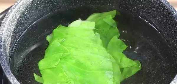 奶锅烧水,水开放入包菜叶,焯水30秒,捞出。