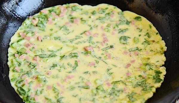 6、并晃动锅子摊均匀,小火煎至两面金黄色即可完成了。刚出炉的芹菜鸡蛋饼清爽不油腻,非常的美味呀。