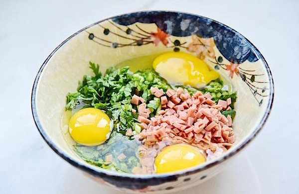 2、把芹菜带叶子一起切碎、同样的把火腿肠也切碎倒入容器中,加入鸡蛋混合。