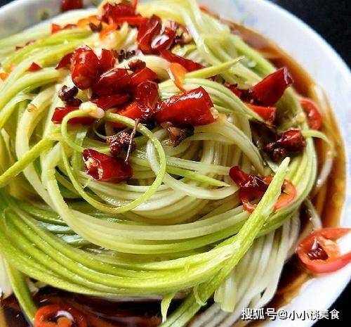 5、辣椒切碎,将花椒、辣椒和油放入勺子中,将勺子放在火上烧至油热并散发出焦香;6.将炒好的辣椒和辣椒油滤入西葫芦中,加入醋和少许盐拌匀,食用时撒上榛子粉。