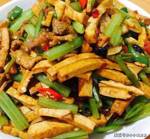 原料:豆腐干260克(咸豆腐片)、芹菜220克、里脊肉100克、豆豉1撮、蒜头3瓣、青椒2个、小米椒3个、植物油、盐、剁椒、生生抽、老抽、白胡椒粉、鸡精适量;