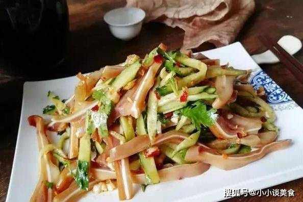 1、黄瓜、香菜洗净切条,大蒜切细段,猪耳朵切条;