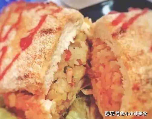 3、将炒饭放在腌好的鸡胸肉中间,卷紧,裹上面包糠,放入200度的油炸锅中炸20分钟左右。