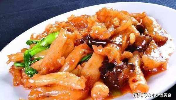 2、猪皮用刀刮干净,用热水冲洗干净,擦去水份,刷上黄酒待用;