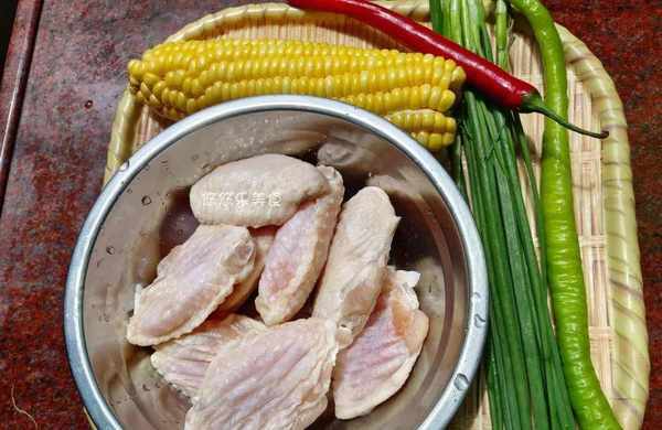 鸡翅,玉米,青红辣椒,小葱,食盐,鸡精,食用油