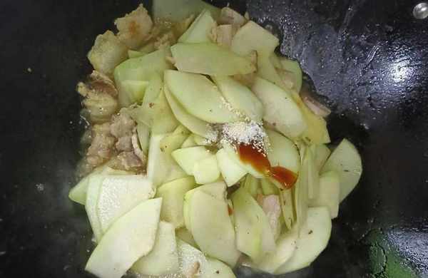 7.炒的过程中要勤翻炒。因为木瓜是青木瓜,所以较硬,炒的时候要加入适量的水,食盐,鸡精,还有番茄酱也一同倒入锅中。铲子将它们炒均匀后,盖上锅盖,放着焖煮会儿;