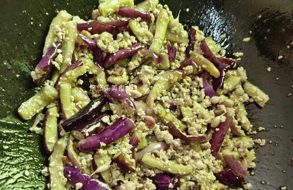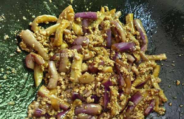 10.因为茄子是用食盐腌锅,所以里面还会有咸味,炒的过程中加入的食盐要少,以免太咸。茄子炒快熟倒入准备好的酱汁,食材炒至均匀后即可关火出锅。