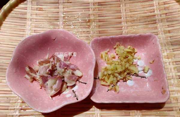 4.蒜瓣跟生姜放在水中冲洗干净,洗净后拍碎;