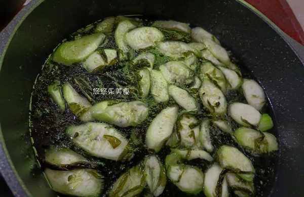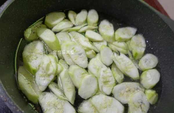 5.等待锅中的水开后,加入一勺食用油。倒入切好的丝瓜片,加入油再煮丝瓜,煮出来的丝瓜不发黑;