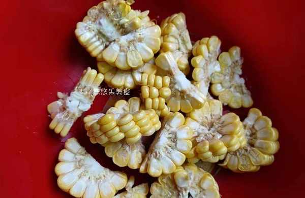 4.准备好的玉米撕掉表面的玉米皮,放在清水中洗净。清洗的时候如果有看到玉米须要将其挑出来,洗净后的玉米切成细段,切好放在盘中备用;