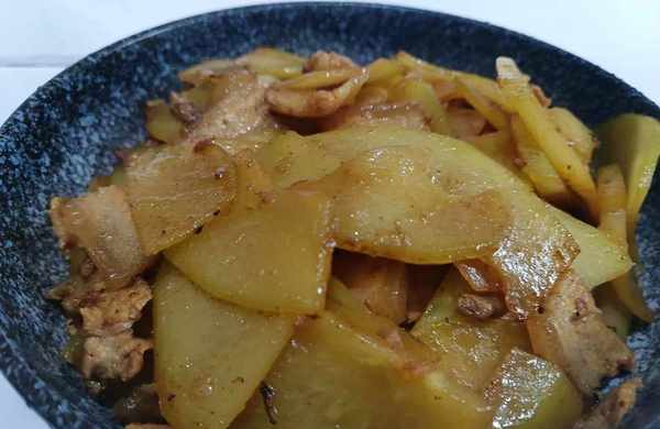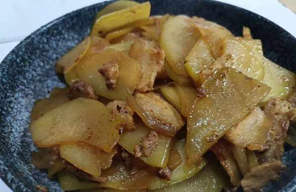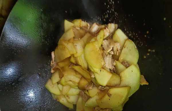 6.三层肉炒至微微干焦后,将切好的木瓜片倒入锅中,用铲子将锅中的食材翻炒均匀;
