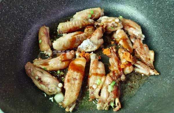 6.中小火将锅中的鸡中翅煎到两面焦黄色,加入番茄酱,烤翅粉,鸡精,还有刚刚切好的葱白,用铲子轻轻地将它们搅拌均匀;