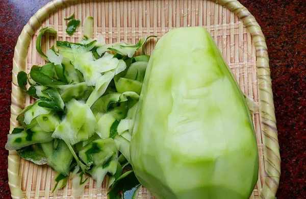3.放在案板上,用刀将准备好的木瓜切成片,切好的木瓜片放在盆中备用;