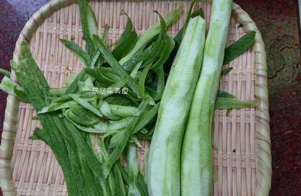 1.准备好的丝瓜放在盘中,准备一个干净削皮刀。将其表皮去掉,丝瓜的皮去掉后放在清水中冲洗干净,洗净后的丝瓜放在一旁备用;