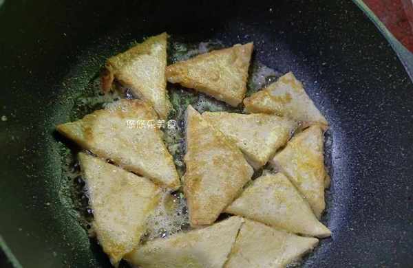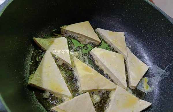 6.锅中的豆腐煎到两面都成金黄的状态后盛出放在盆中备用