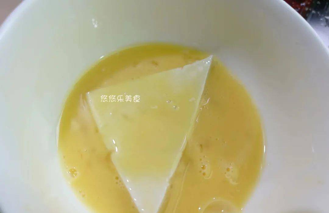 3.鸡蛋的表面清洗干净,打入碗中,筷子将它们搅拌均匀。切好的豆腐放在鸡蛋液中裹一层蛋液;
