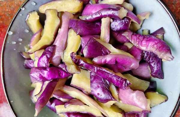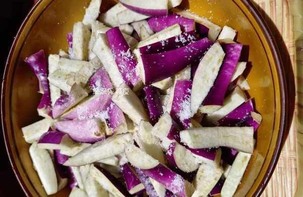 2.茄子再用刀对半切开,随后再将其改刀切成细段,切成下面这种状态。因为茄子中含有碱物质,如果直接放在空气中,没一会儿就会变颜色。所以切好的茄子块要放在水中或者加入食盐,抓均匀,使其颜色保持原有的翠绿透亮;
