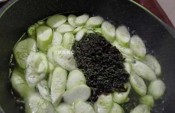 7.丝瓜跟紫菜都很容易煮熟,所以在煮的过程中,锅盖不用盖着,就这样等待锅中的水开。用铲子将食材搅动一下;