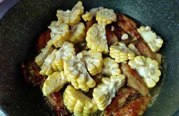 8.放入切好的玉米块,加入少量的水,随后盖上盖子焖煮5-8分钟;