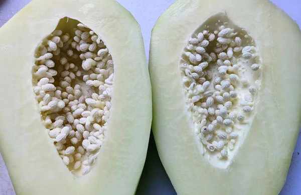 2.用刀将木瓜切成两半,切好后,用勺子将里面的木瓜籽去掉。木瓜中的白瓢也要去掉,要不然会发苦;