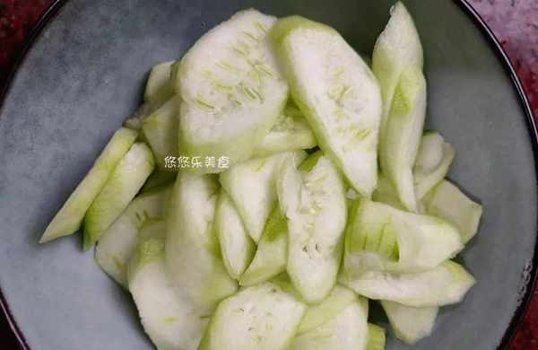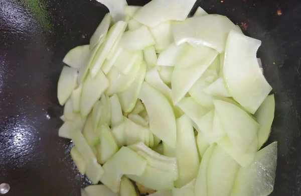 2.丝瓜放在案板上,用刀将其切成细片,切好的丝瓜片放在盘中备用;