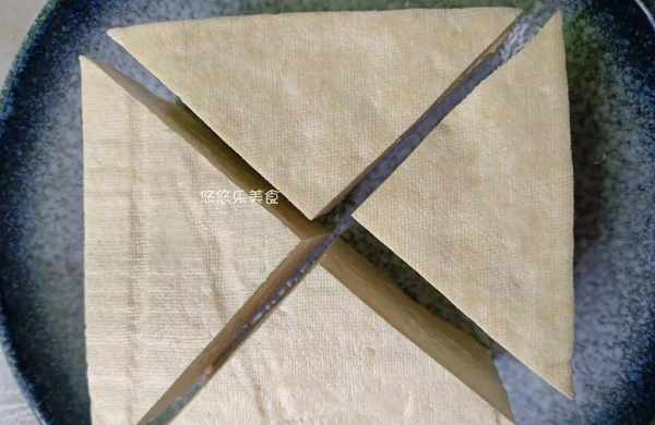 1.买回来的豆腐放入水中,往里面加入适量的食盐浸泡会儿。经过浸泡的豆腐,捞出再用清水冲洗干净,洗净后的豆腐放在盘中,用刀将其沿着四角切开,如下图。随后再用刀将豆腐切成三角形小片,切好放在盆中备用;