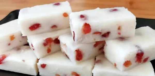 1、准备200克山药去皮,改刀切成段。装入盘中。上锅蒸熟。然后将蒸熟的山药压成泥,再加入120克牛奶,15克白糖,20克时尚,充分混合均匀。再加入100克大米粉搅拌均匀成浓稠的状态。然后再加入25克喜欢吃的果干,搅拌均匀。