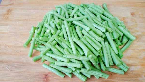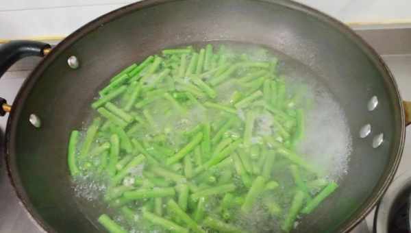 2、起锅烧水,水开后放油和盐,把豆角焯至2到3分钟,然后过凉控水备用